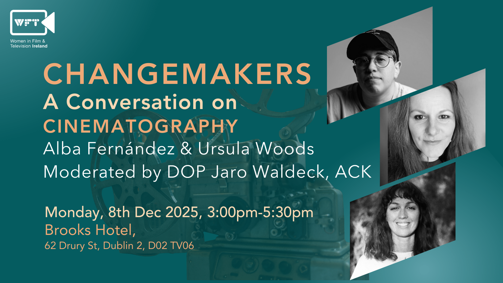 On December 8th, from 3:00 PM to 5:30 PM at The Brooks Hotel, Dublin, we’ll go behind the scenes with two Irish-based cinematographers, Alba Fernandez and Jaro Waldeck, ACK, and Tasmanian cinematographer Ursula Woods.